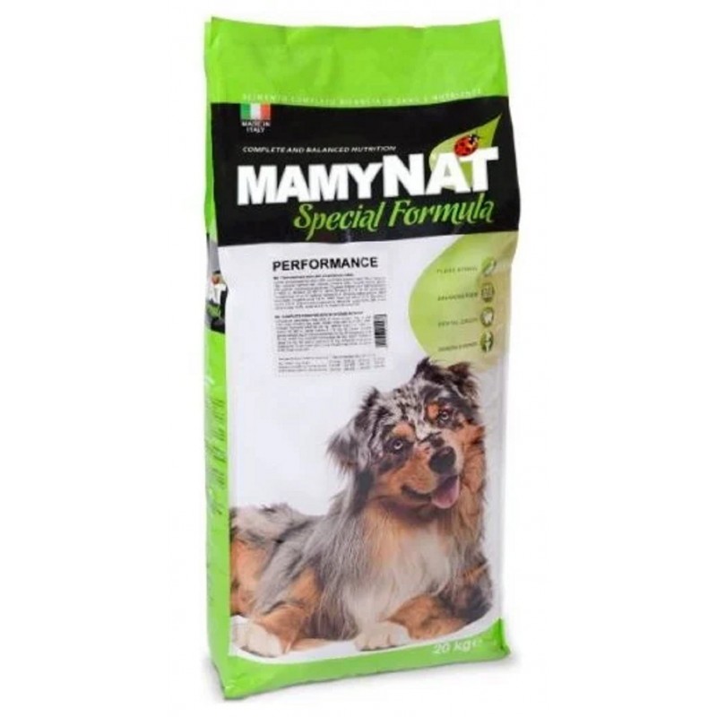 Mamynat Performance - идеальный корм для правильного питания собаки с интенсивной активностью. Куриное мясо с легко усваиваемыми белками, говяжье мясо богатое белками, горох как источник углеводов которые помогают сбалансировать гликемический индекс, обогащенный льняным семенем как хорошим источником омега-3, жирными кислотами и сбалансированным набором витаминов и минералов. Всё это делает Mamynat Performance отличной пищей для собак, которым нужно много энергии (сухой корм).